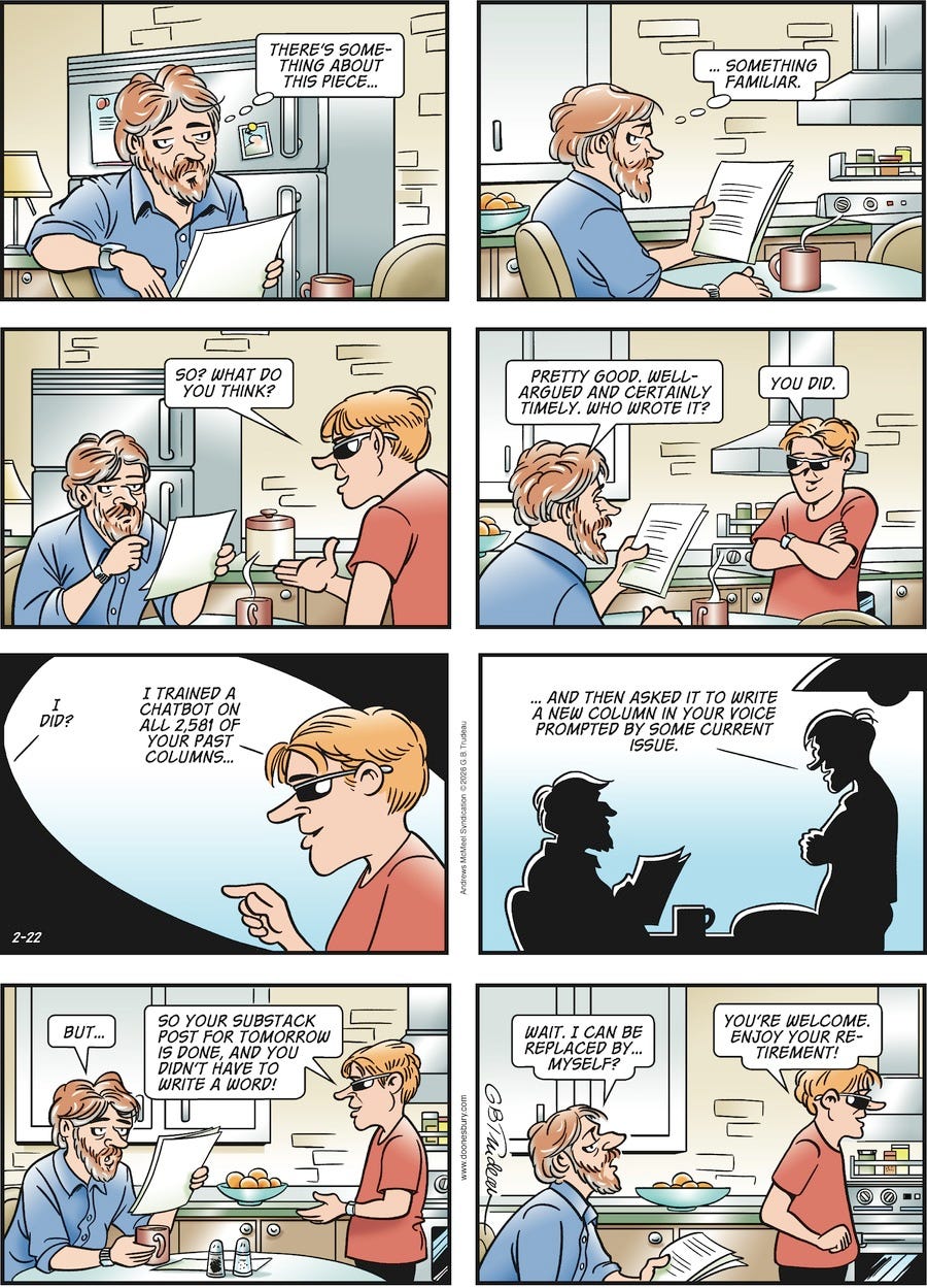 Temptation, Always Knocking on My DoorJim FreemanFeb 22, 202611ShareHasn’t happened, won’t happen unless I keel over in the street, but what then?Misha could keep me going as long as ChatGPT isn’t discovered as a fraud.Hi-ho, Silver…AWAY!!!SubscribeShareThe Dark Side of the Moon is a reader-supported publication. To receive new posts and support my work, consider becoming a free or paid subscriber.Subscribe